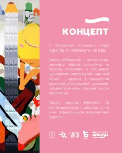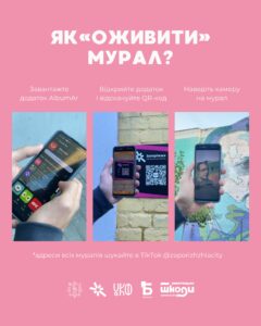 На стінах деяких міських бібліотек і мистецьких шкіл також з’явилися інтерактивні мурали, що оживають просто на очах. Варто лише навести камеру на QR-код — і ви побачите, як оживає ціла історія.